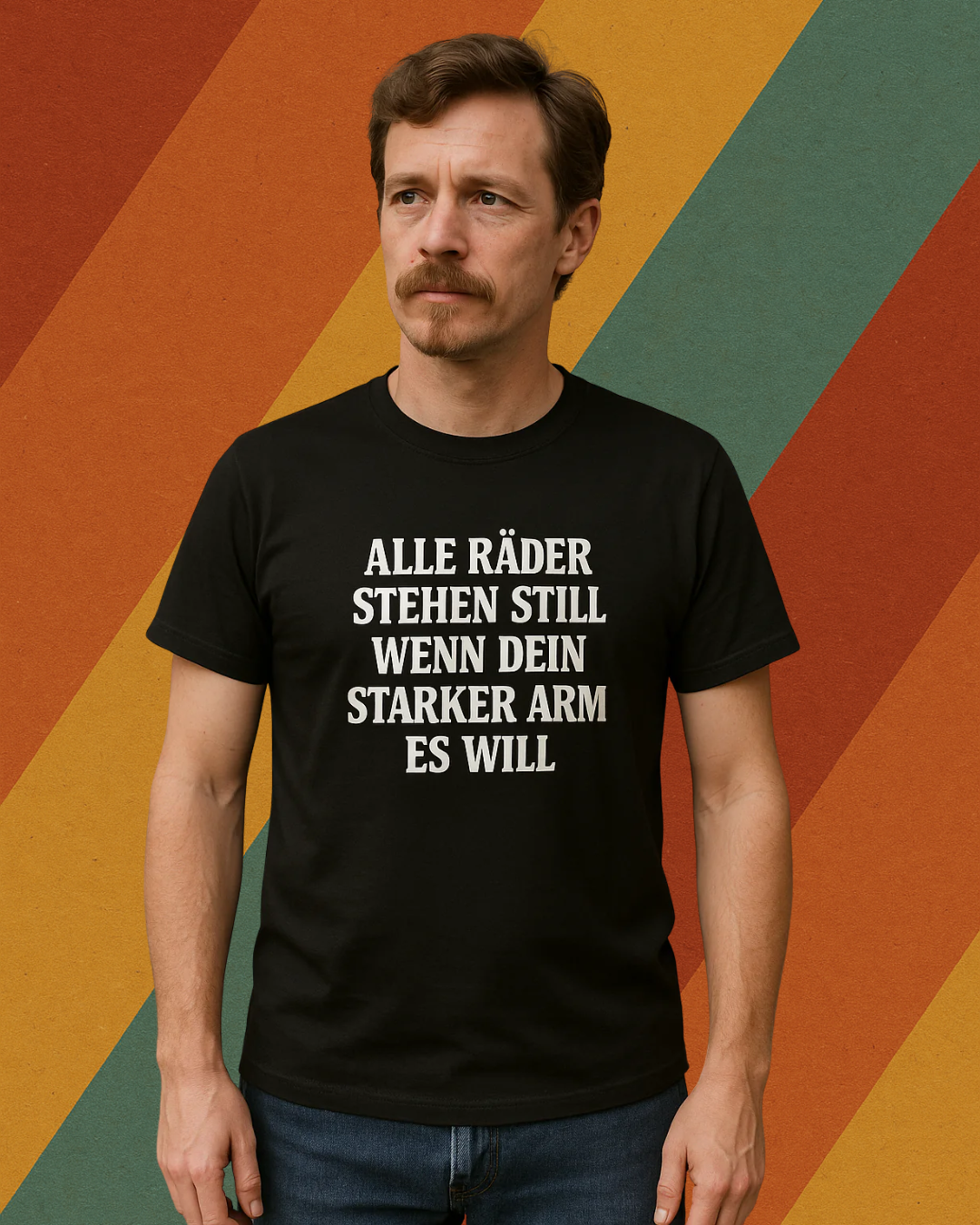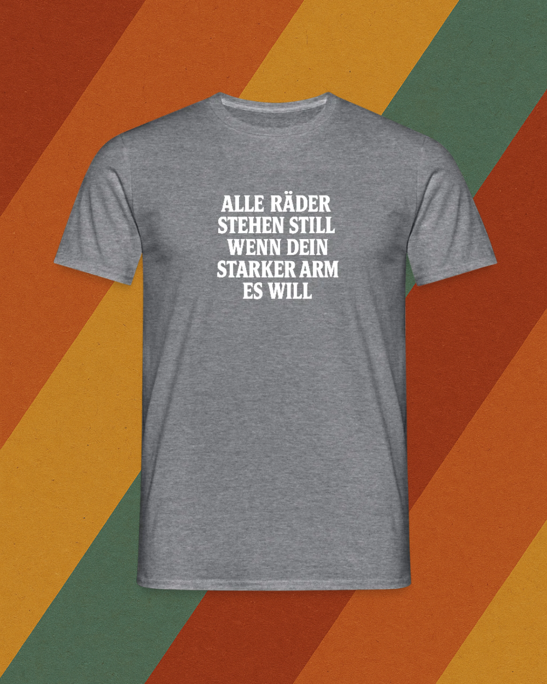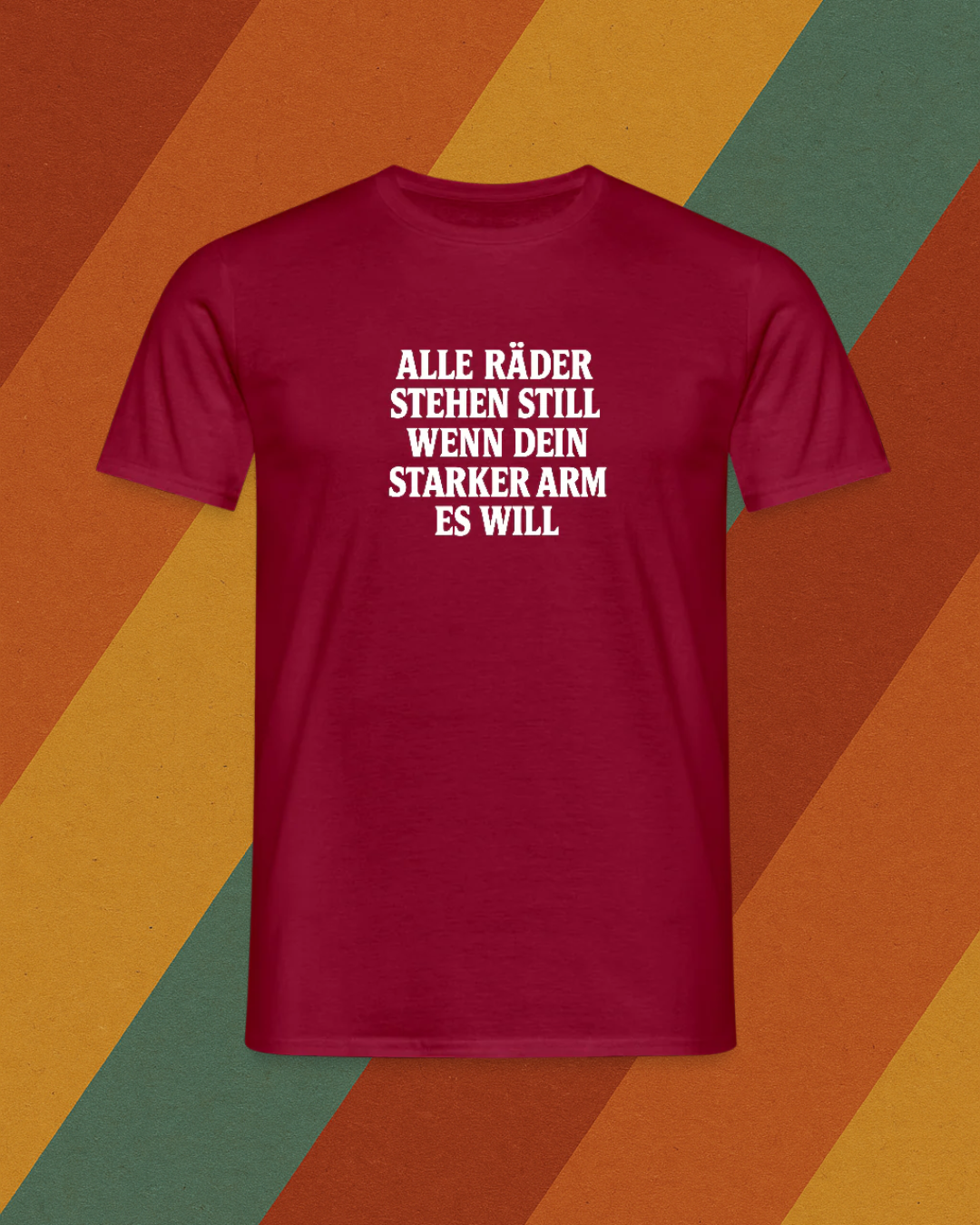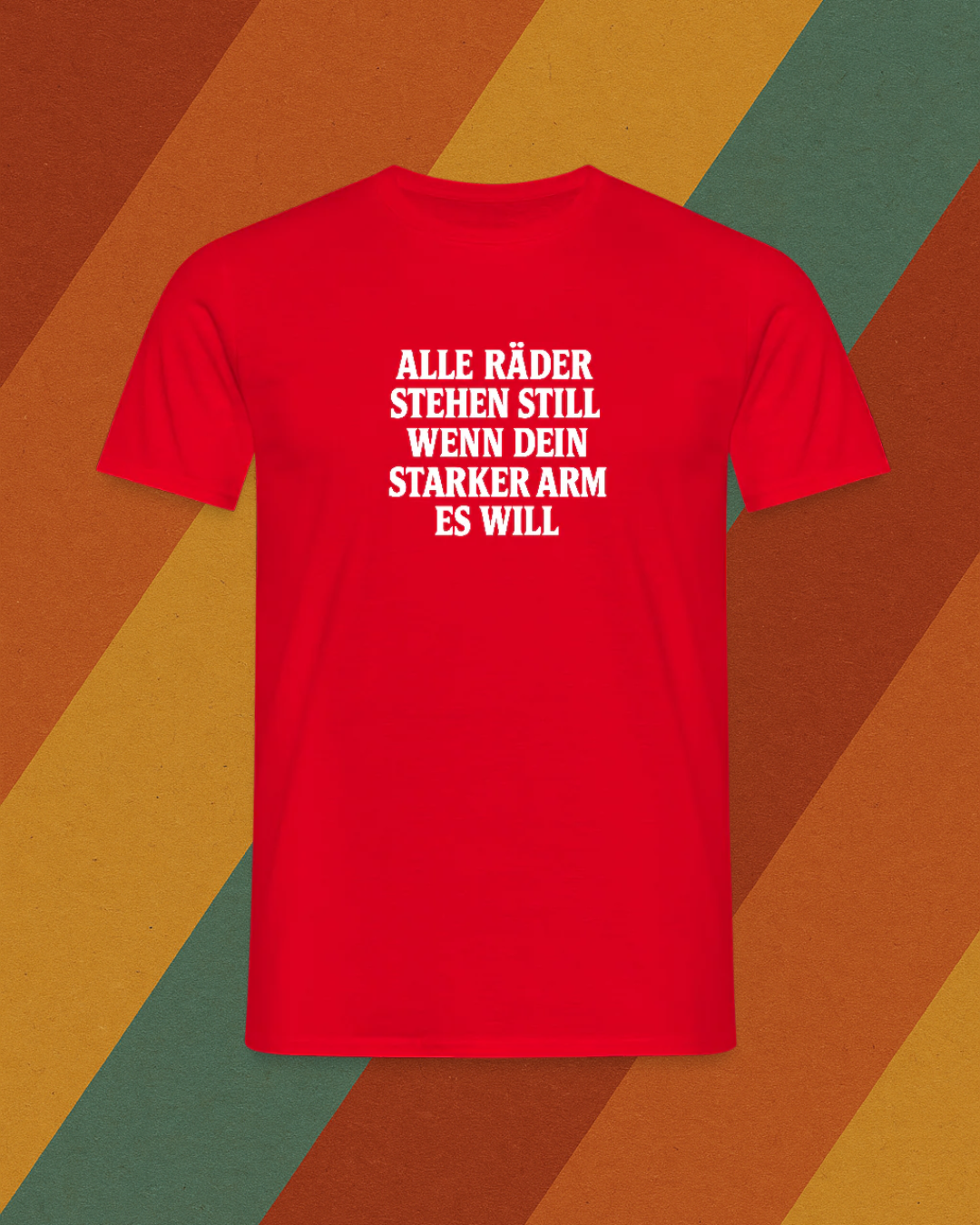 ✍️ Ein politisches Statement, ein historischer Leitspruch: Dieses Shirt zitiert den berühmten Kampfruf der Arbeiterbewegung – „Alle Räder stehen still, wenn dein starker Arm es will“ – kraftvoll in Weiß auf Schwarz.