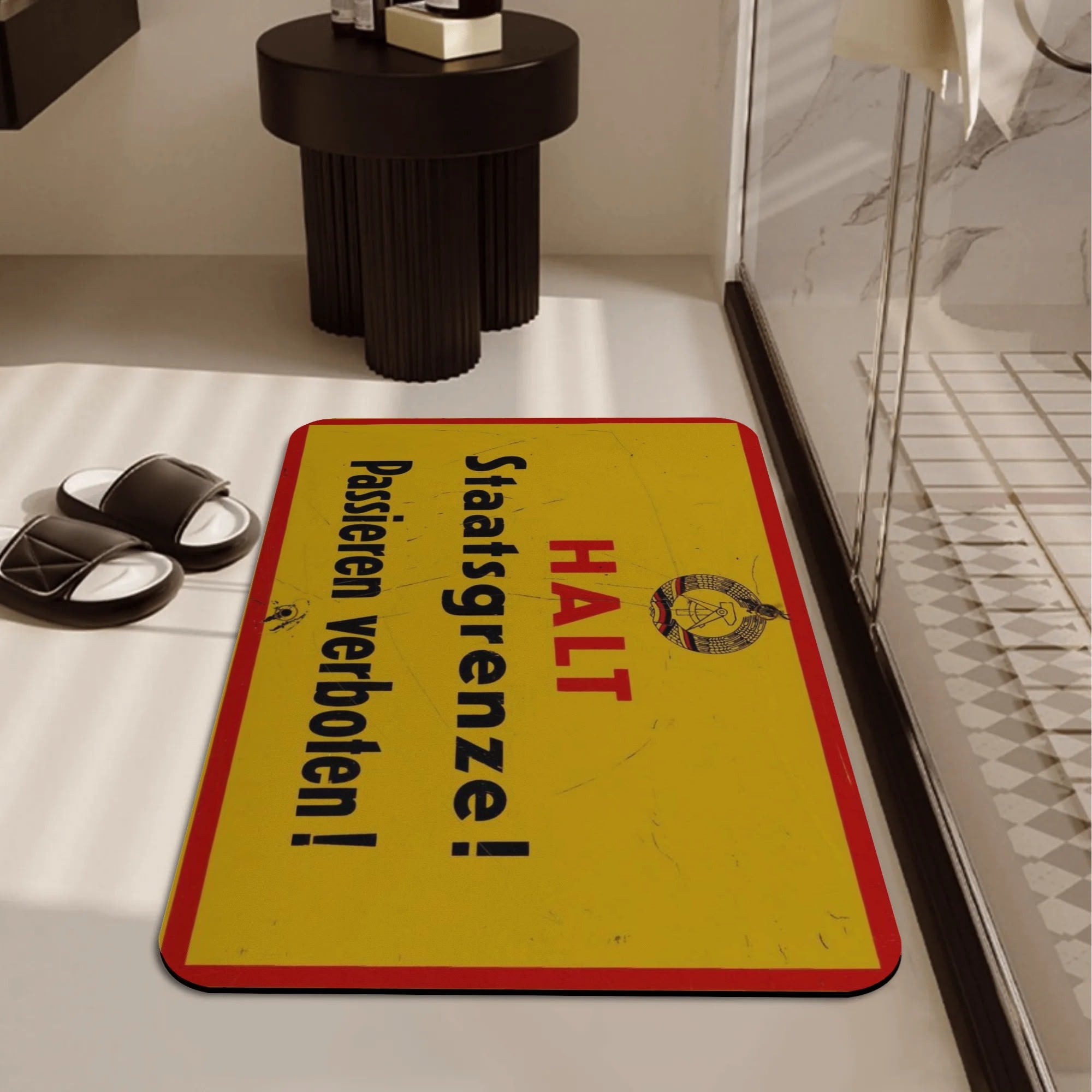 Das Design erinnert an das ikonische Grenzschild der DDR. Es verbindet Funktion mit Haltung – und bringt ein Stück DDR-Geschichte zurück in den Alltag. Egal ob morgens nach dem Duschen oder als kultiger Hingucker im Gäste-WC: Diese Matte ist Ostalgie pur.
