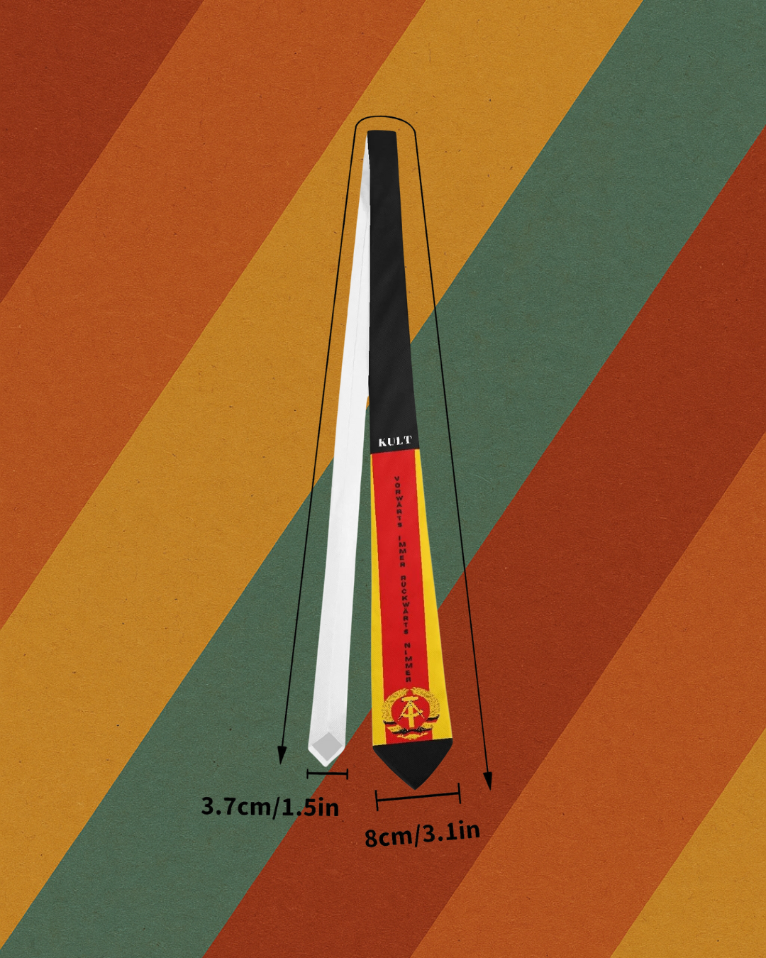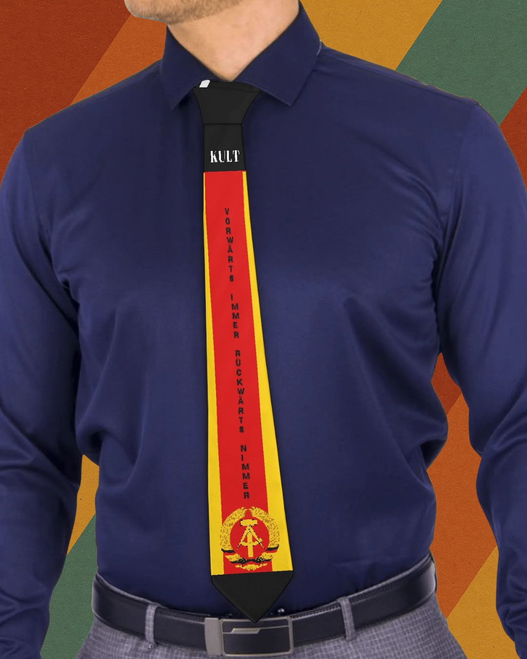 Ob im Büro, auf der Feier oder im Alltag – diese DDR Krawatte mit Vorwärts immer rückwärts nimmer Slogan, KULT-Branding und DDR-Wappen bringt Ost-Charme an dein Outfit.