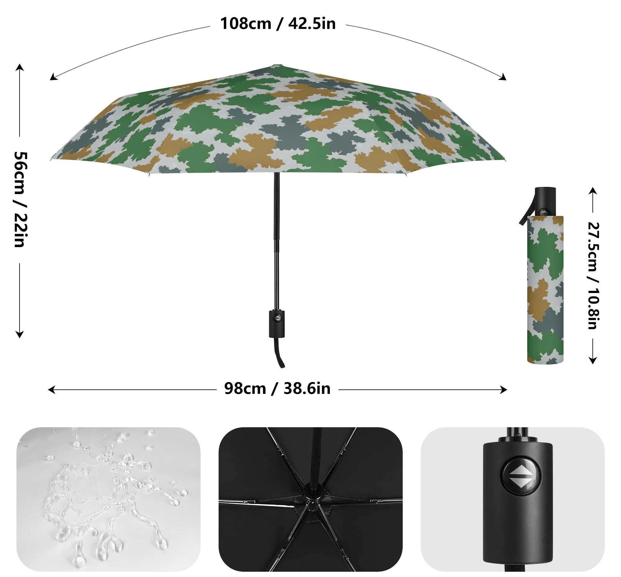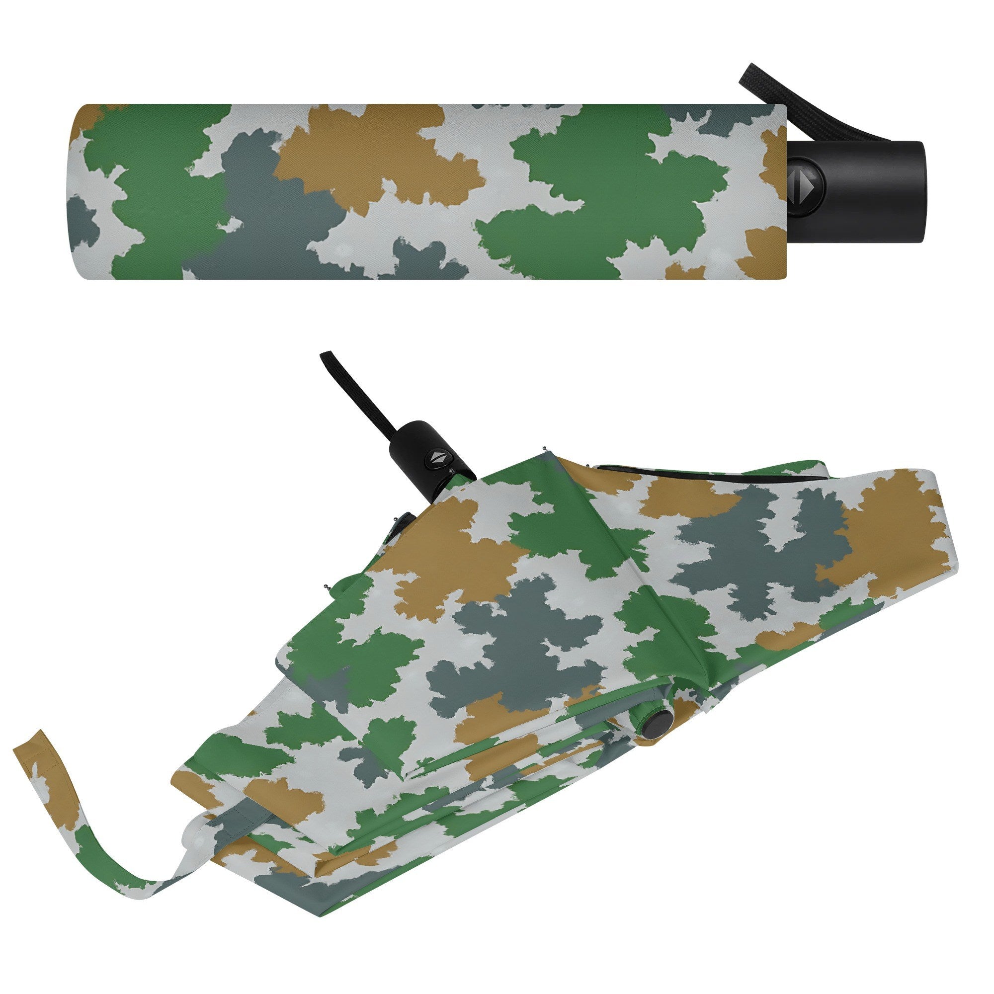Regen oder Sonne – mit diesem Regenschirm im legendären Flächentarn-Design der DDR bist du perfekt ausgerüstet. Das Tarnmuster, bekannt aus den Beständen der NVA, macht diesen Schirm zu einem echten Ost-Kultstück.